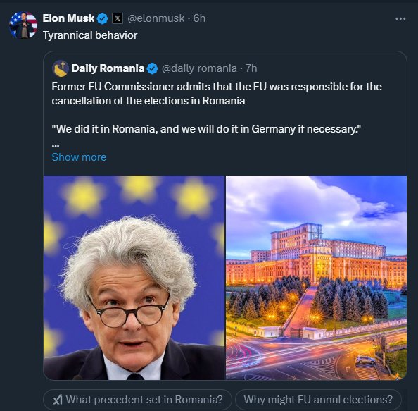 Spre deosebire de liniștea complicilor la lovitura de stat de pe la noi, Elon Musk a distribuit această declarație, caracterizând’o ca un „comportament tiranic” al Uniunii Europene cu privire la această implicare directă în procesul electoral și implicit lovitură de stat din România.